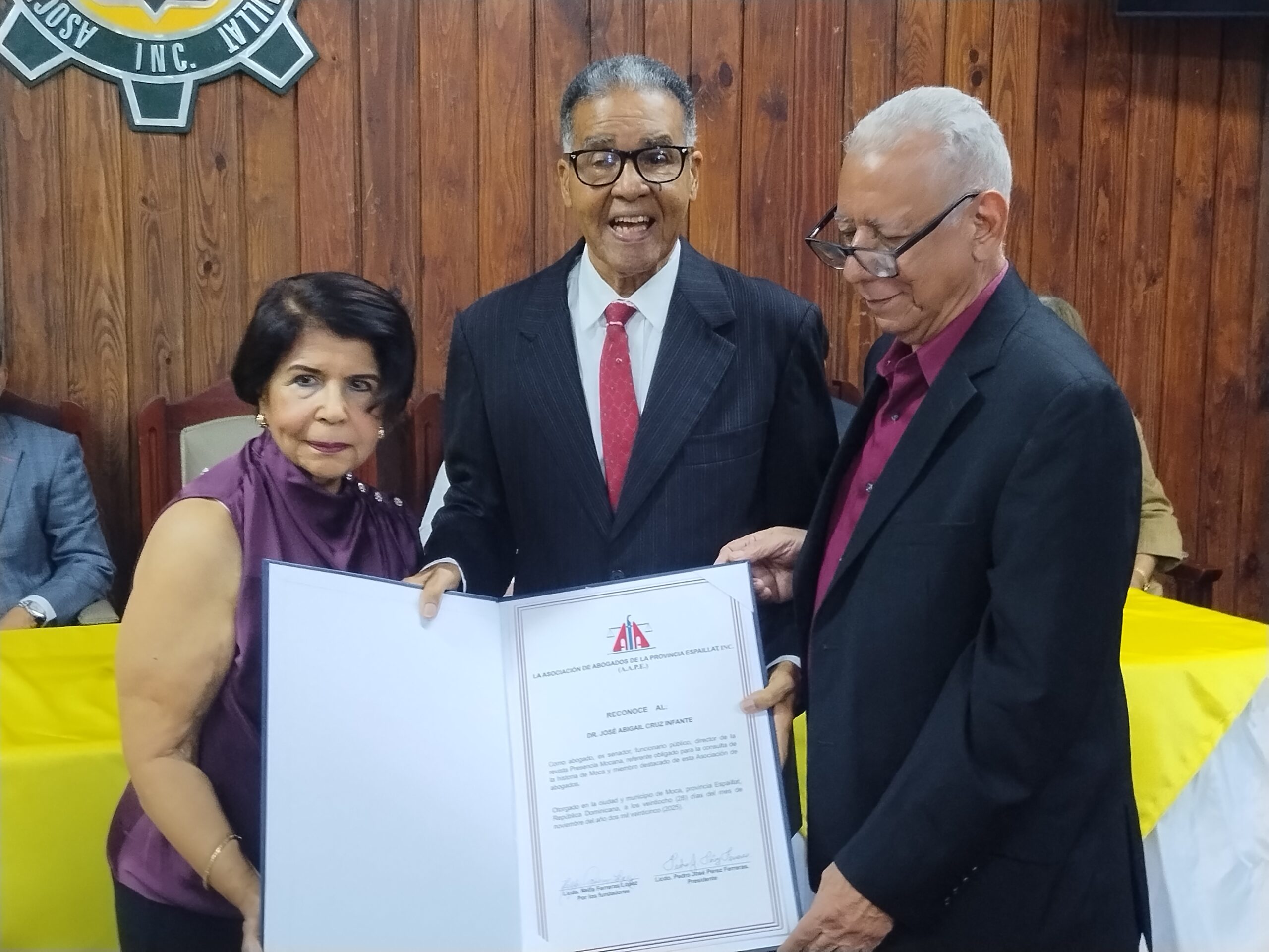 El Colegio de Abogados de la República Dominicana, filial Espaillat, otra de las instituciones de Moca, que entregó al exsenador una placa de reconocimiento, a cargo de una comisión del gremio que encabezó su presidenta la licenciada Juana Garcia, en compañía de los miembros Carlos Garcia, Alfredo Martinez, exfiscal del municipio de Gaspar Hernández, Arismendis Reyes Morel, entre otros directivos.